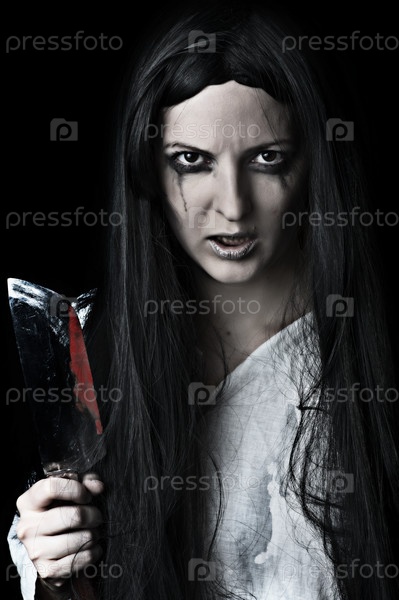 Страшная женщина-зомби на черном фоне с окровавленным ножом