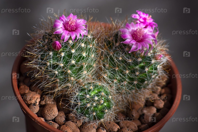 Кактус маммиллярия с цветами на темном фоне