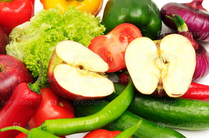 Свежие фрукты и овощи, изолированные на белом фоне
