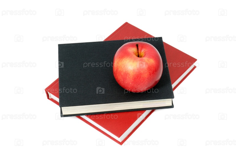 Красное яблоко на книгах, изолированных на белом фоне