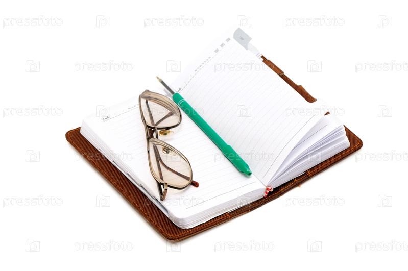Блокнот, очки и ручка, изолированные на белом фоне