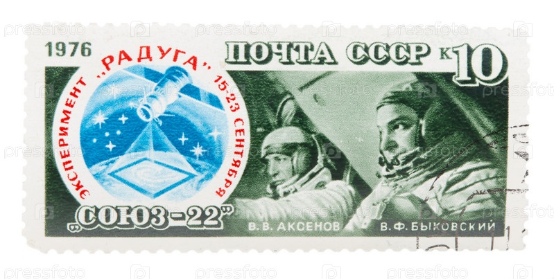 Почтовая марка СССР 1976 года, посвященная эксперименту Радуга. Изображены корабль Союз-22 и астронавты В.В. Аксенов и В.А. Быковский