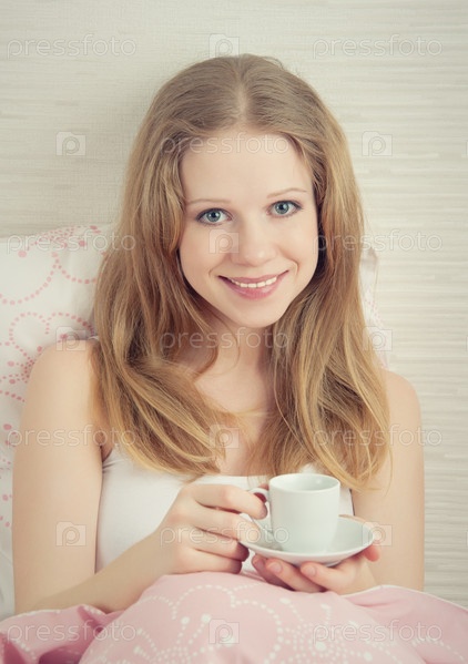 Красивая блондинка пьет кофе, сидя в кровати в спальне