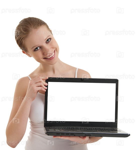 Красивая девушка с ноутбуком на белом фоне