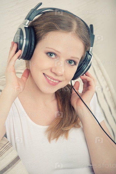Красивая молодая женщина слушает музыку в наушниках, лежа на диване