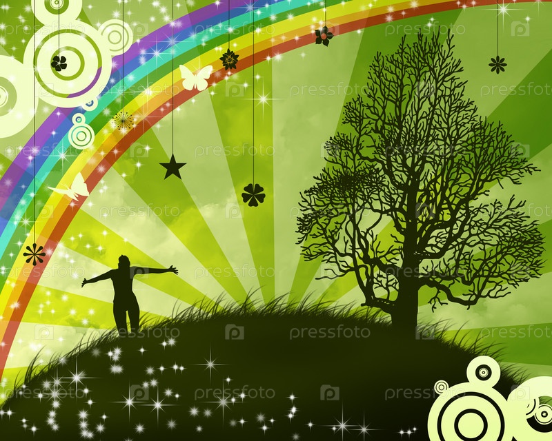 Силуэт девушки на острове с радугой и большим деревом