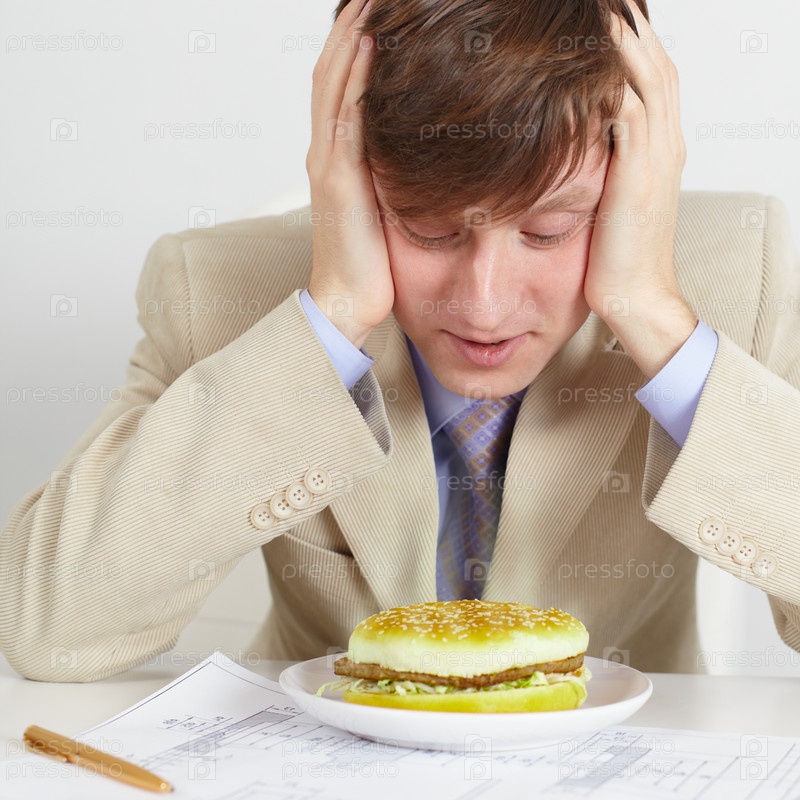 Молодой человек смотрит на гамбургер голодными глазами, сидя за столом