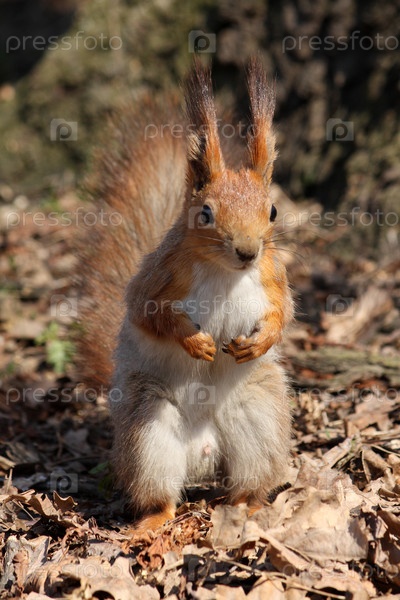 Небольшая красивая белка в городском парке