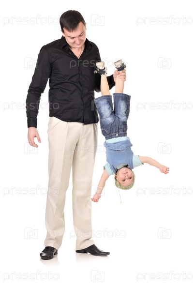 Мужчина держит маленького мальчика вниз головой на белом фоне