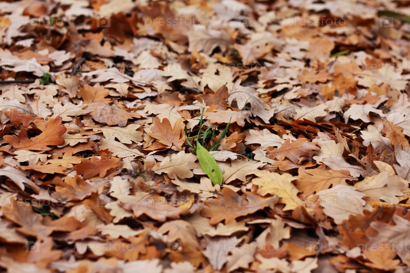 Зеленая травинка среди дубовых листьев в осеннем парке