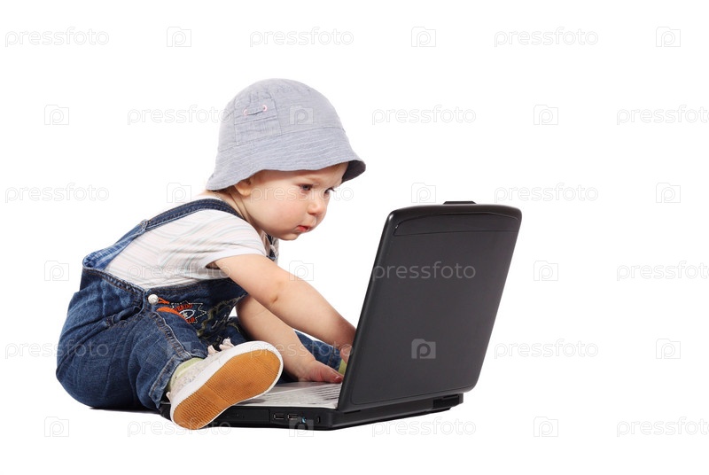 Маленький мальчик сидит с ноутбуком, изолированный на белом фоне