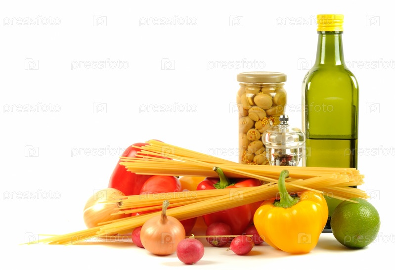 Овощи, масло, макаронные изделия и различные специи на белом фоне