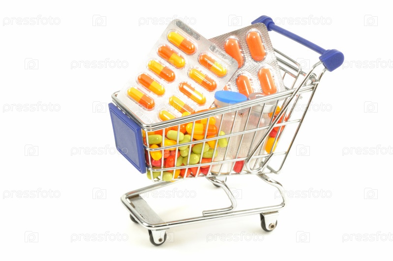 Магазинная тележка с упаковками лекарств на белом фоне