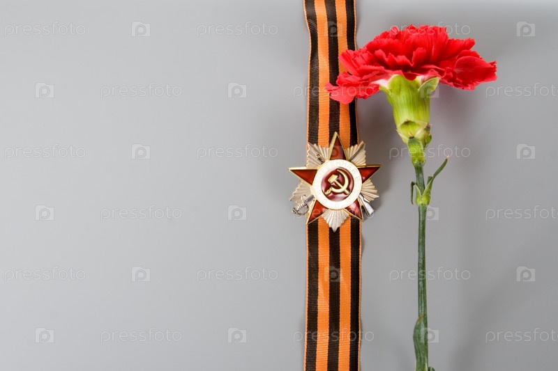 Орден Отечественной войны на ленте Святого Георгия и гвоздика на сером фоне