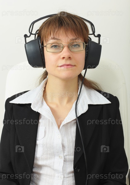 Уставшая женщина в очках с большими черными наушниками на голове на светлом фоне