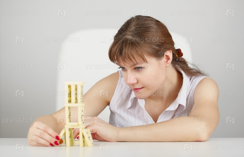 Молодая девушка собирает башню из костей домино, сидя за столом