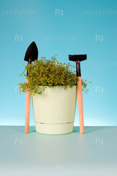 Инструменты и водяной салат на голубом фоне