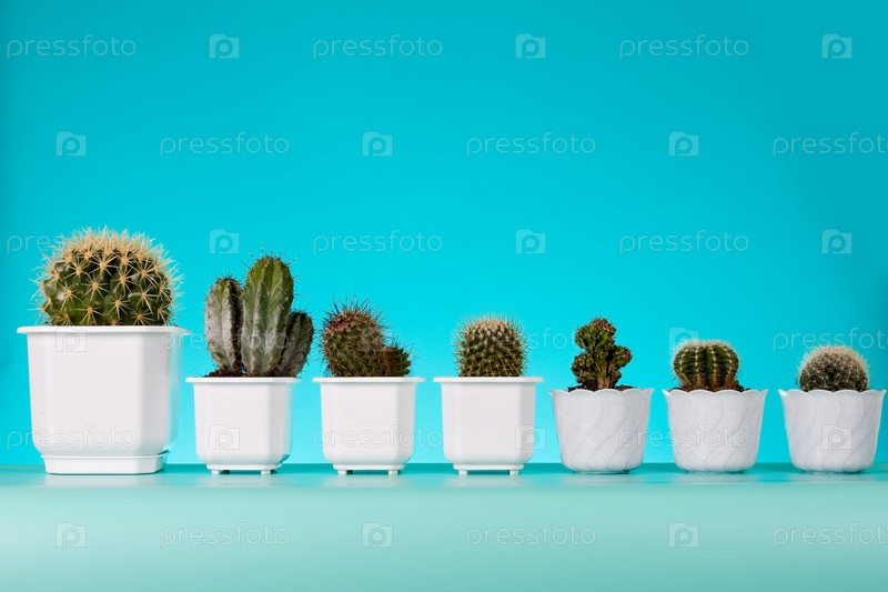 Кактусы в горшках на синем фоне