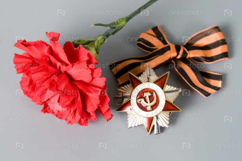 Орден Отечественной войны на ленте Святого Георгия и гвоздика на сером фоне