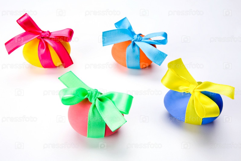 Изображение нескольких разноцветных яиц, связанных шелковыми лентами на белом фоне