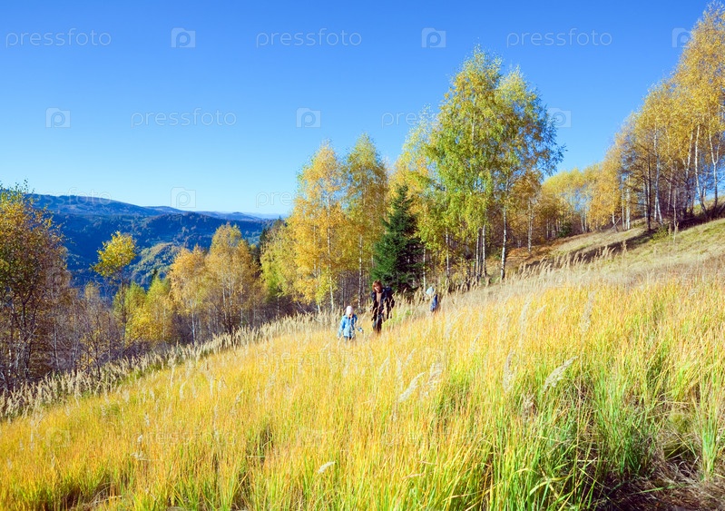 Семья (мать с детьми) идет по склону горы. Перевал Нимчич, Карпаты, Украина