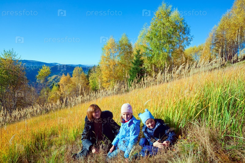 Семья (мать с детьми) на склоне горы. Перевал Нимчич, Карпаты, Украина