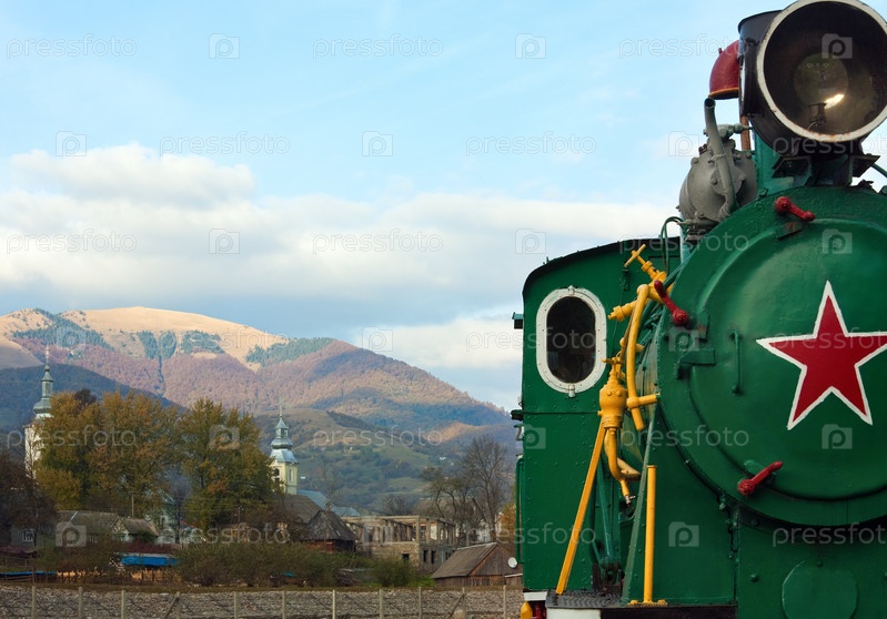 Горная деревня и часть старого локомотива с пятиконечной красной советской звездой туманным утром в Карпатских горах, Украина