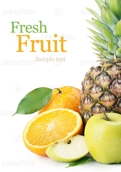 Ананас, яблоки и апельсины на белом фоне