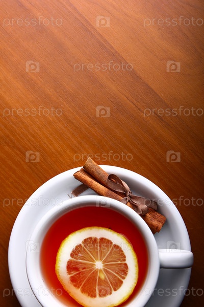 Чашка горячего чая с лимоном на деревянном столе