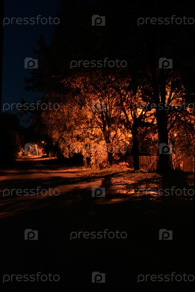 Ночная деревенская улица, освещенная фонарями