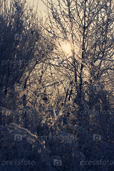 Солнечный свет сияет сквозь ветви деревьев и кустарников в зимний морозный день