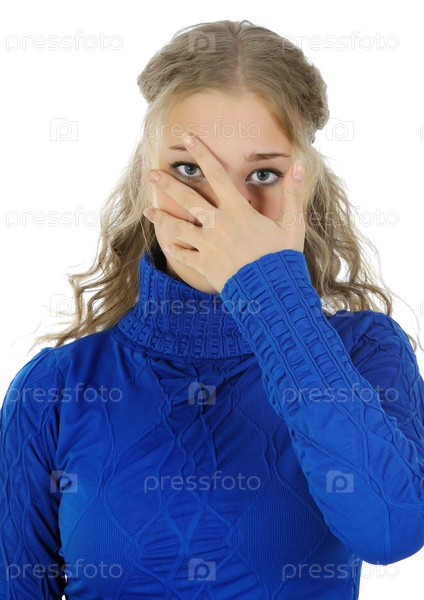 Шокированная женщина закрывает лицо руками на белом фоне