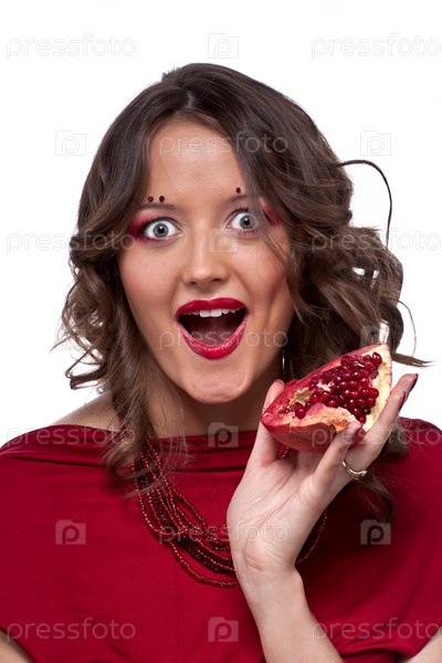 Портрет молодой красивой женщины с гранатом в руке на белом фоне