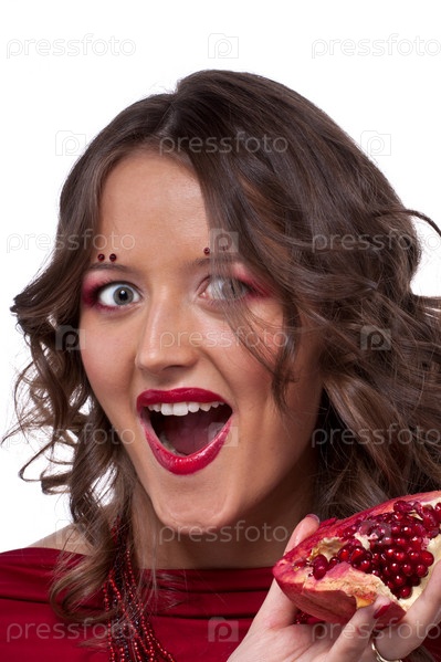 Портрет молодой красивой женщины с гранатом в руке на белом фоне