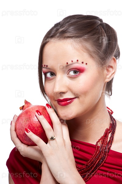 Портрет молодой красивой женщины с гранатом в руке на белом фоне