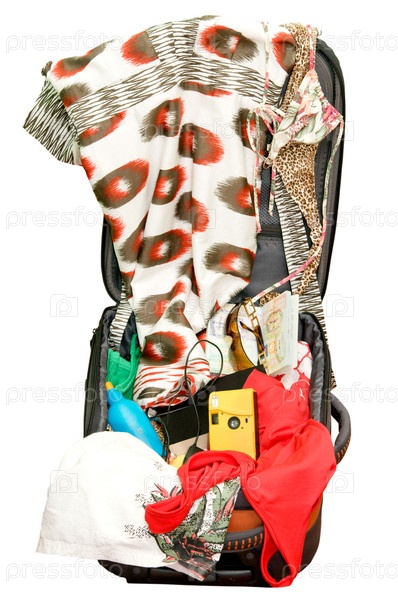 Открытый чемодан с фотоаппаратом, паспортом, очками, книгами и одеждой