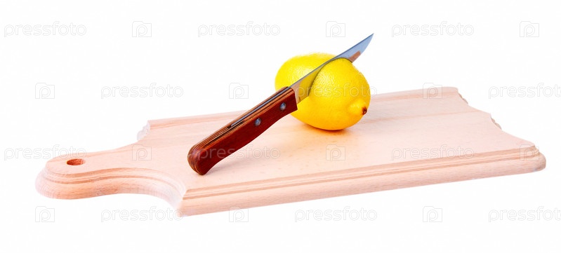 Нож и лимон на деревянной дощечке, изолированные на белом фоне