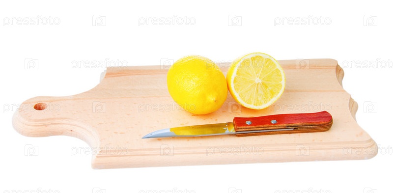 Нож и лимоны на деревянной дощечке, изолированные на белом фоне