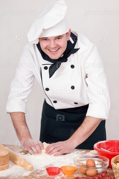 Повар месит тесто для приготовления пищи