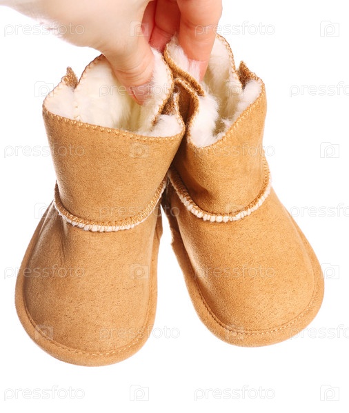 Пара коричневых детских зимних сапог в женской руке на белом фоне