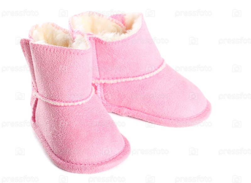 Пара розовых детских зимних сапог на белом фоне