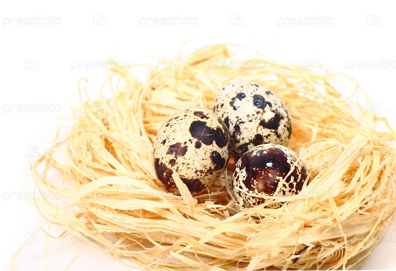 Перепелиные яйца в гнезде, изолированные на белом фоне