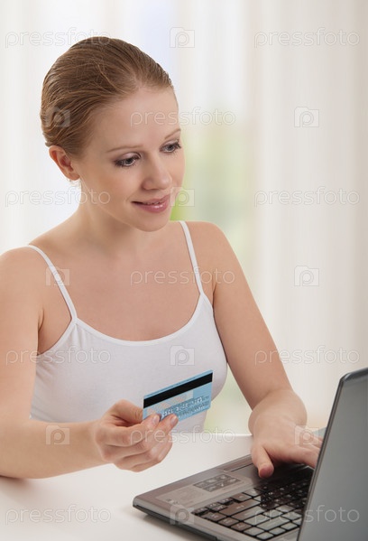 Красивая молодая женщина с ноутбуком делает оплату онлайн из дома, используя кредитную карту