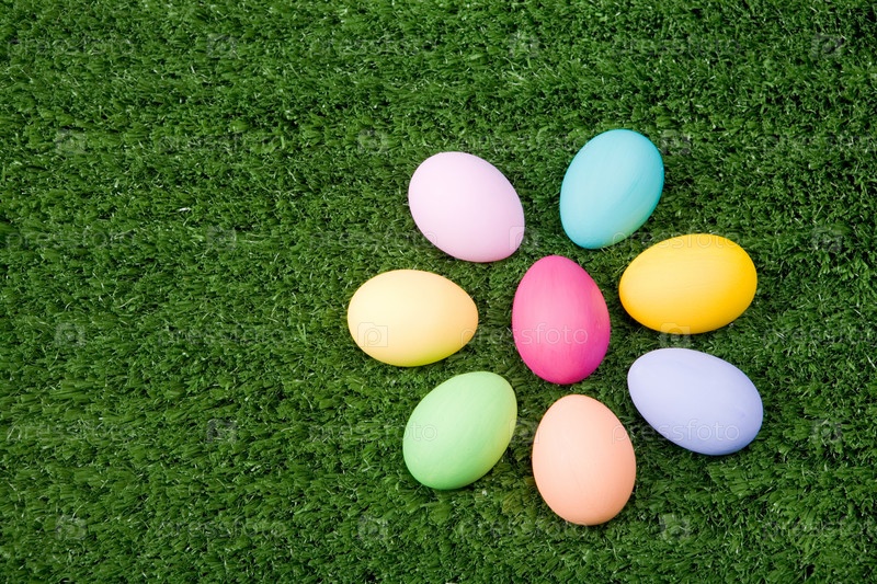Близкий план красочных пасхальных яиц на зеленой траве