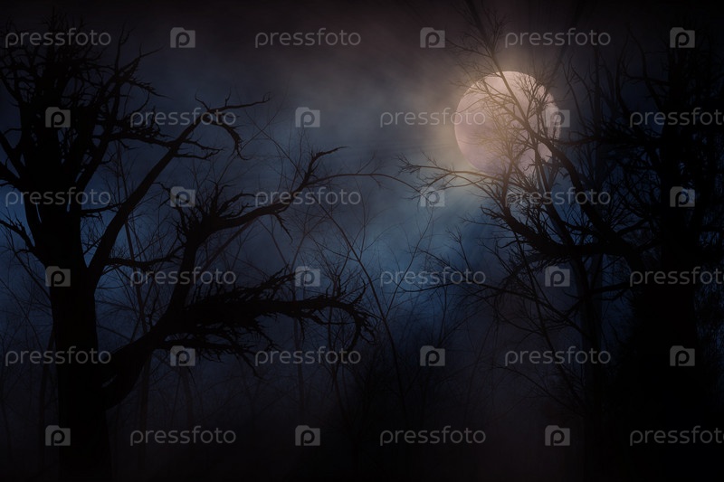 Яркая луна в облаках в ночном лесу