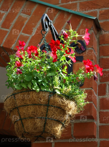 Петуния висит в горшке на красной кирпичной стене