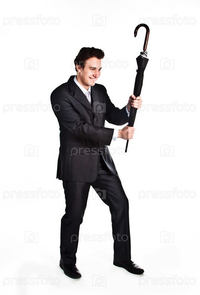 Молодой, респектабельный и успешный бизнесмен в темном деловом костюме с зонтом