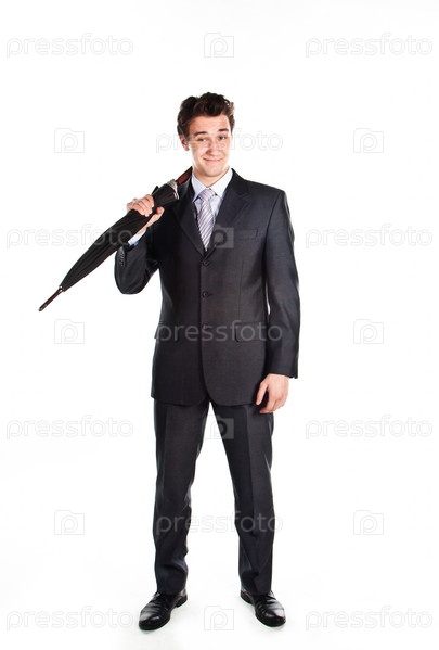 Молодой, респектабельный и успешный бизнесмен в темном деловом костюме с зонтом