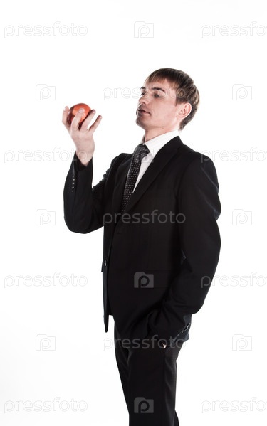 Молодой, респектабельный и успешный бизнесмен в темном деловом костюме с красным яблоком