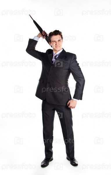 Молодой, респектабельный и успешный бизнесмен в темном деловом костюме с зонтом